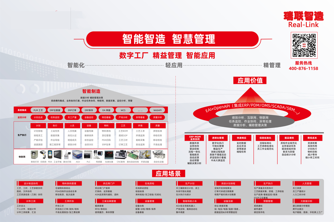 瑞联智造R9智能制造系统,针对不同应用场景,帮助企业实现数据分析、辅助管理决策、系统横向集成、业务纵向打通、作业任务协同、物联网、数据采集、监控分析等,让企业开展全方位数字化转型,实现对企业的全景管控与自适应调整,从而在复杂变化的环境中实现可持续发展。